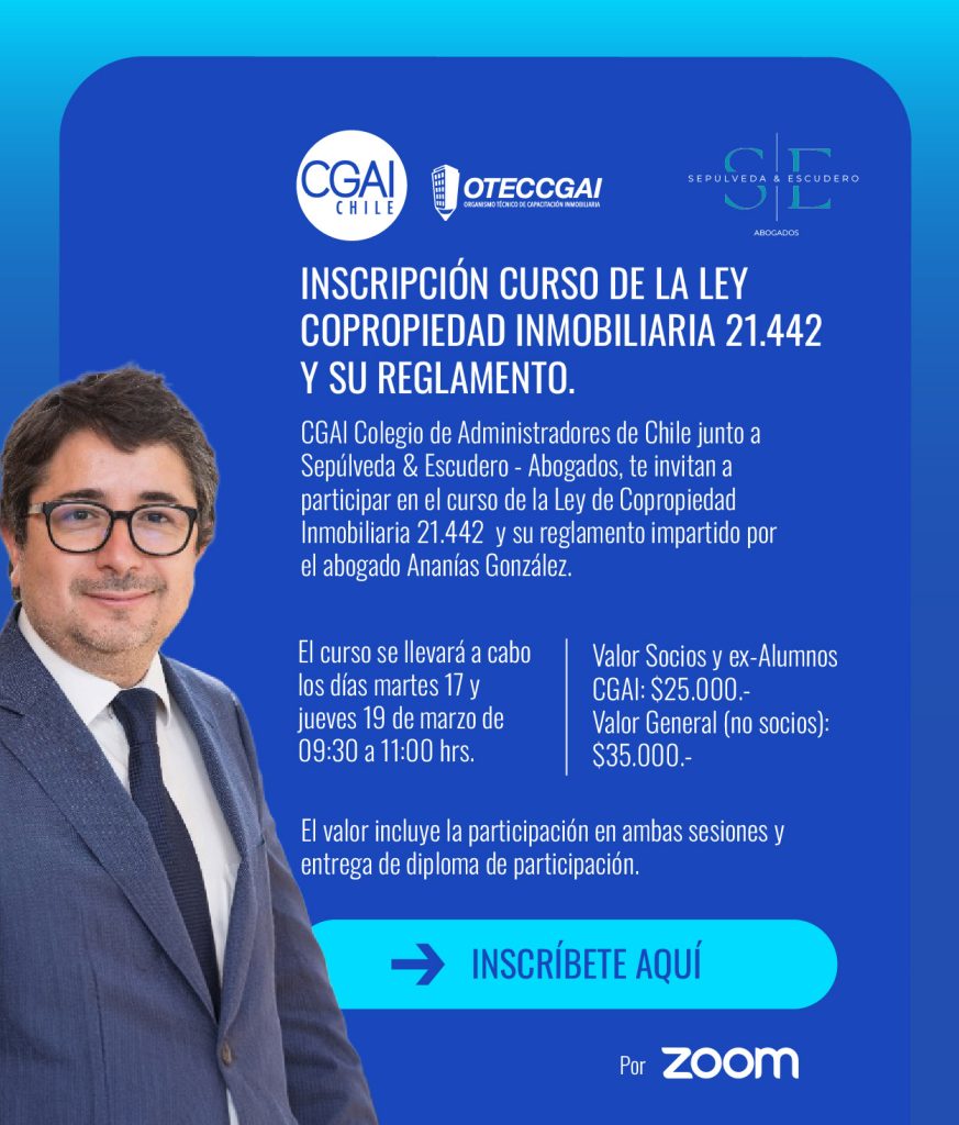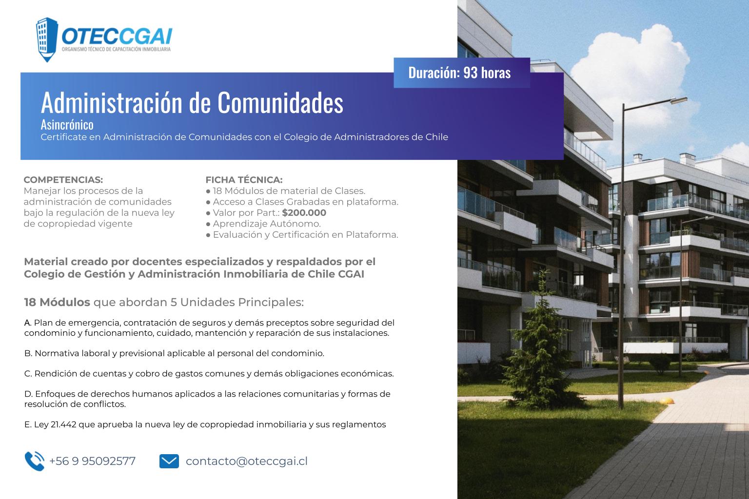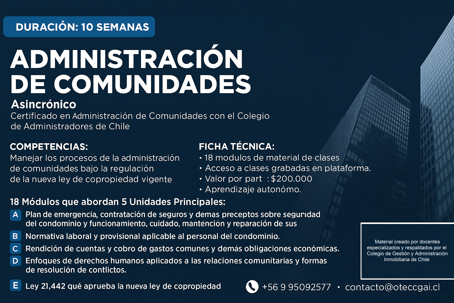 -Requisitos: tener mayoría de edad, ser chileno o extranjero con residencia vigente en el país, no tener condenas de Títulos VIII y IX del Libro Segundo del Código Penal, educación media aprobada, curso de capacitación en materias de administración de condominios o certificación de competencia laboral.